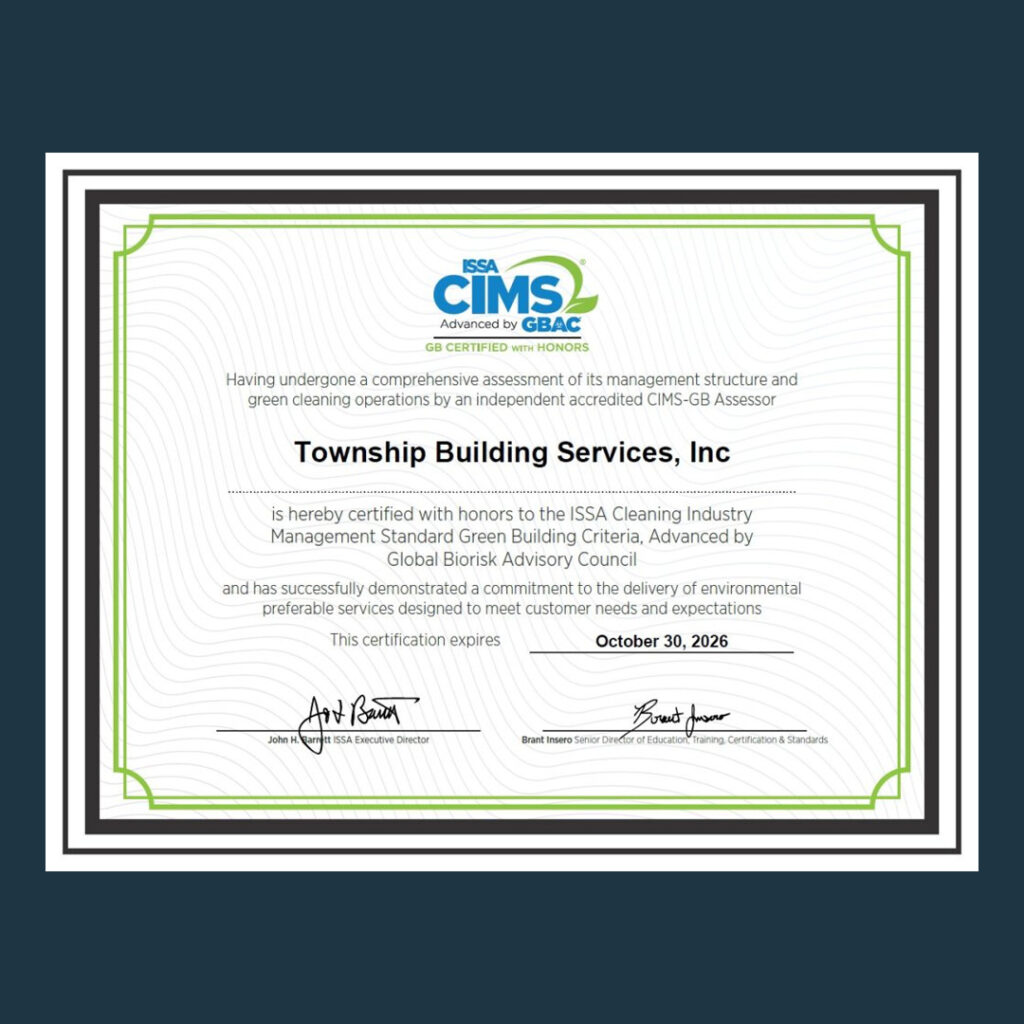 Township is proud to announce that it has received the Cleaning Industry Management Standard (CIMS) certification from the International Sanitary Supply Association (ISSA), a significant milestone underscoring its commitment to operational excellence and sustainability. The ISSA CIMS certification is a globally recognized standard that demonstrates a comprehensive and effective approach to cleaning management. This achievement